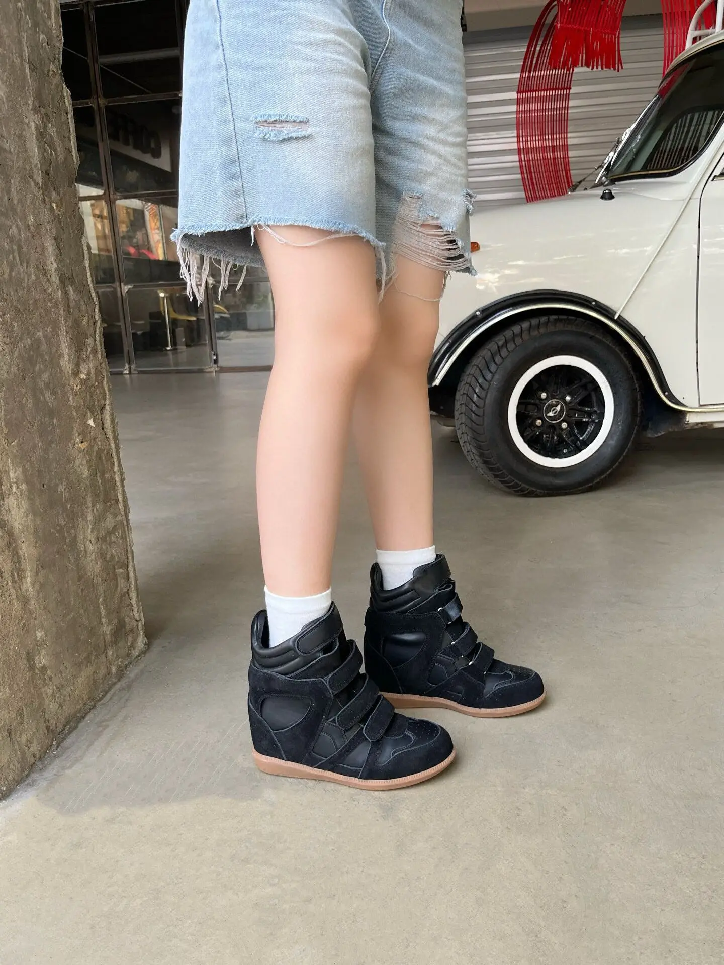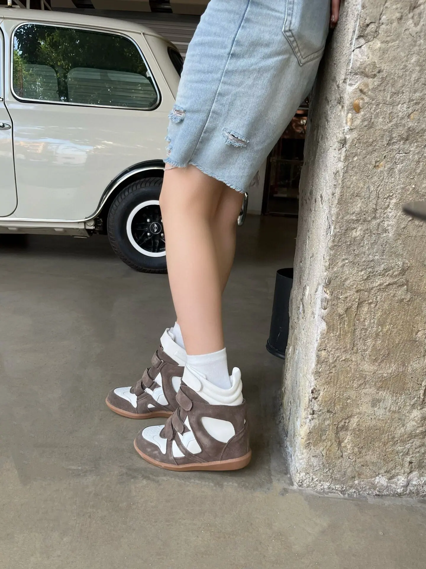 Baskets Montantes Femme Compensées 8cm Cuir Vachette - Sneakers Sport Casual Scratch Respirantes