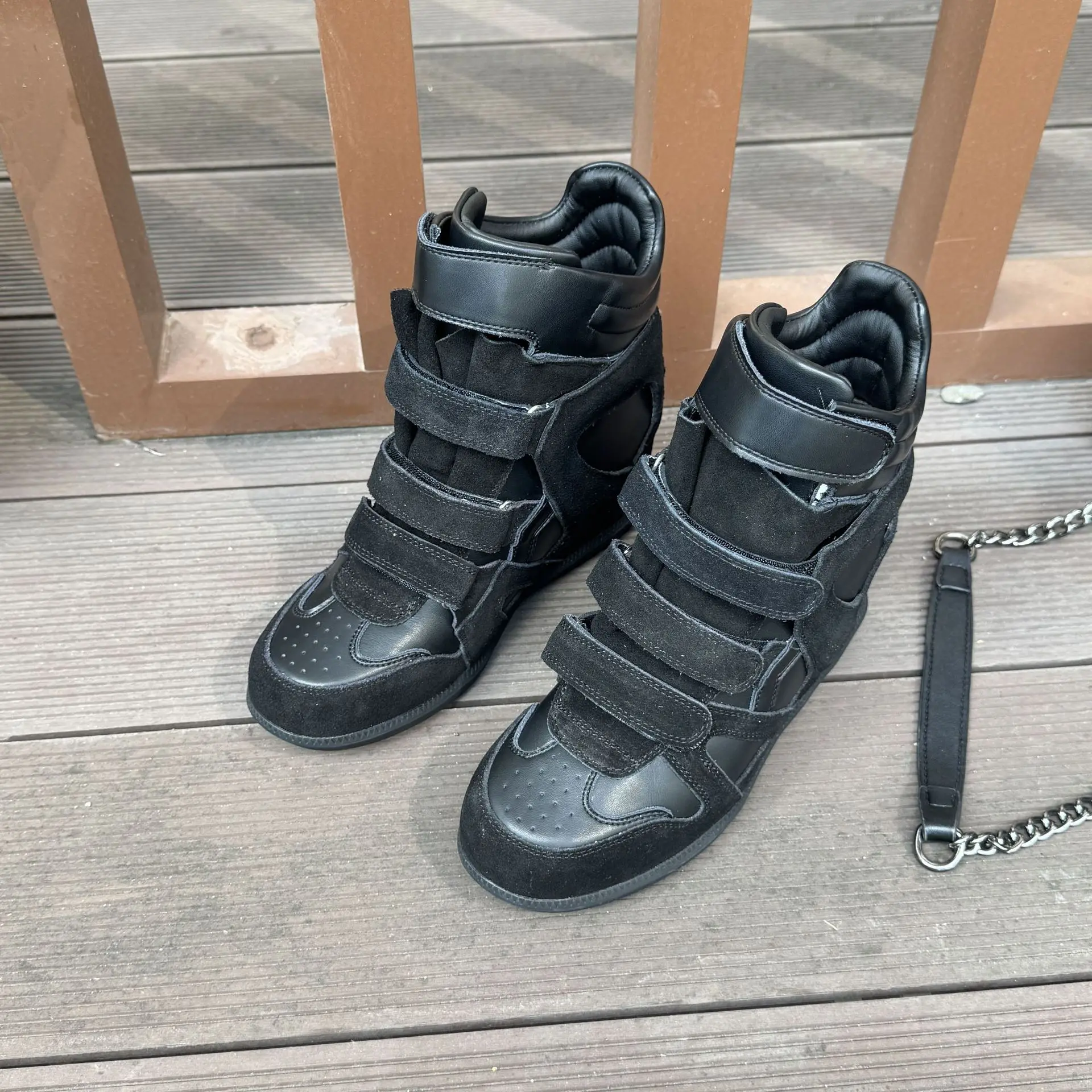 Baskets sport montantes compensées +8cm hauteur intérieure. Cuir vachette deux couches premium durable luxueux. Semelle peau mouton confort exceptionnel régulation thermique. Scratch magic tape ajustable facile. Toutes saisons adaptées. Polyvalentes multi-sports activités. Respirantes confortables. Design montant high-top soutien cheville.