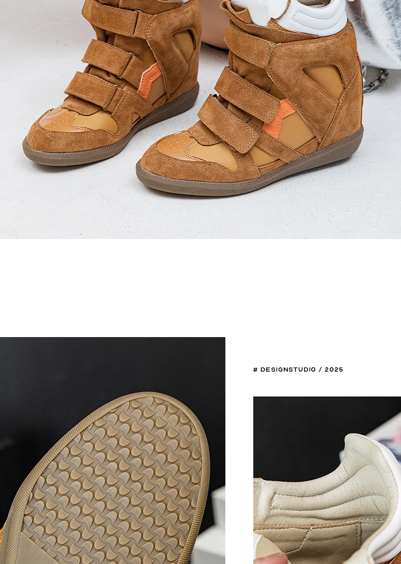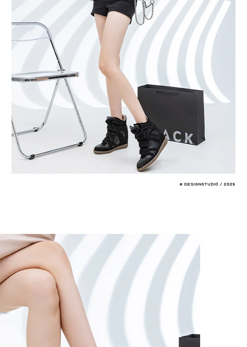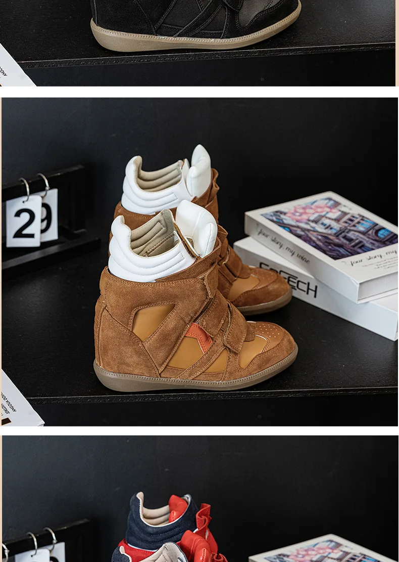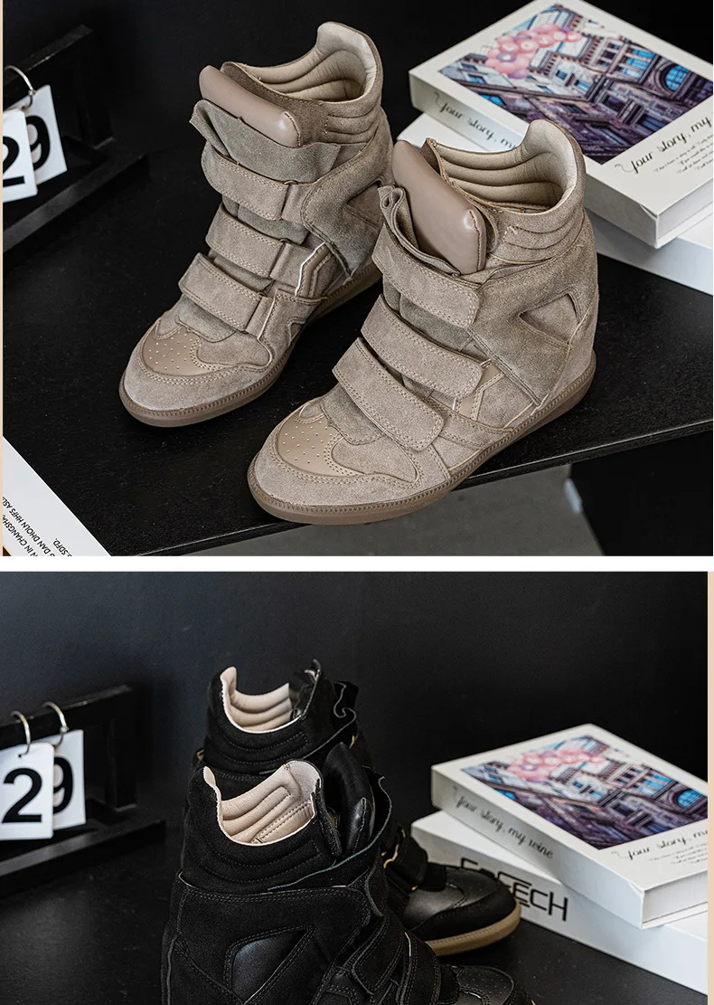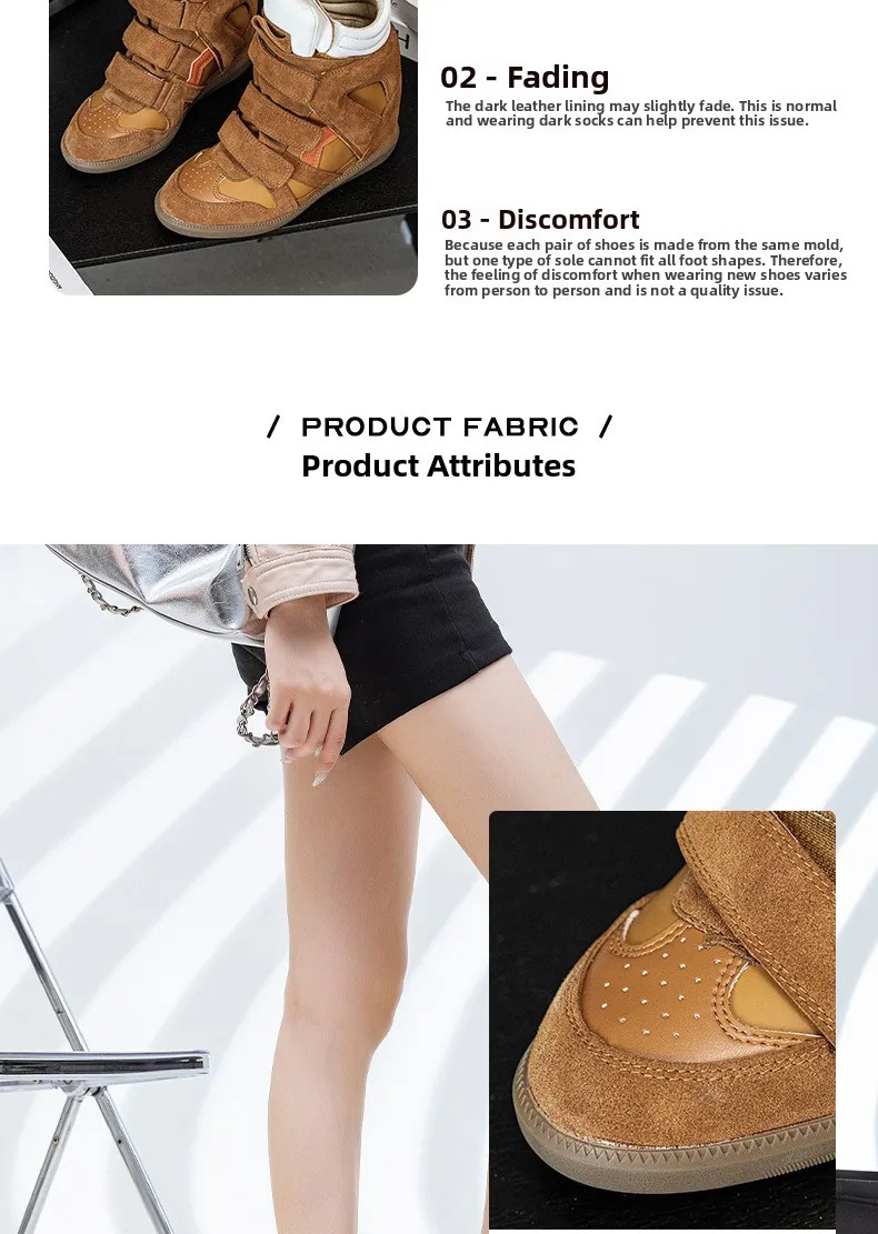 Bottines compensées intérieures +8cm hauteur secrète. Fermeture scratch magic tape enfilage facile rapide. Semelle caoutchouc durable antidérapante. Cuir peau porc + matériaux spéciaux confort. Bout rond élégant spacieux. Toutes saisons adaptées. Petites tailles disponibles. Style professionnel casual polyvalent.