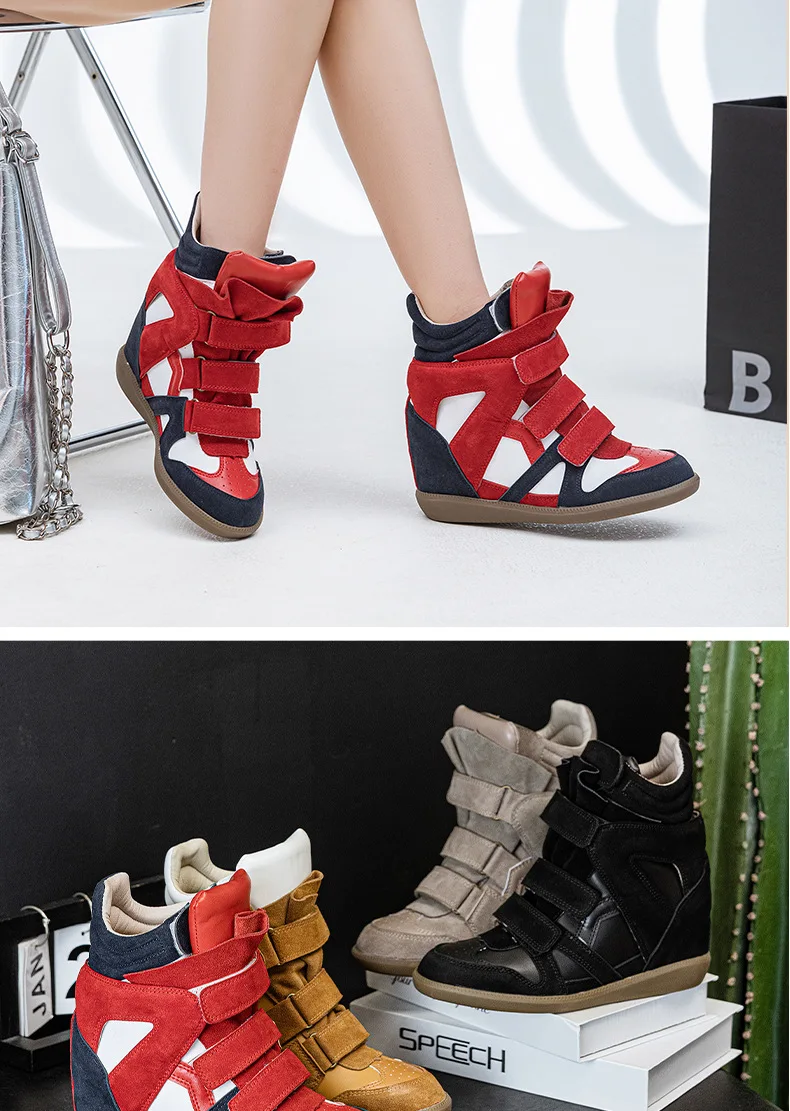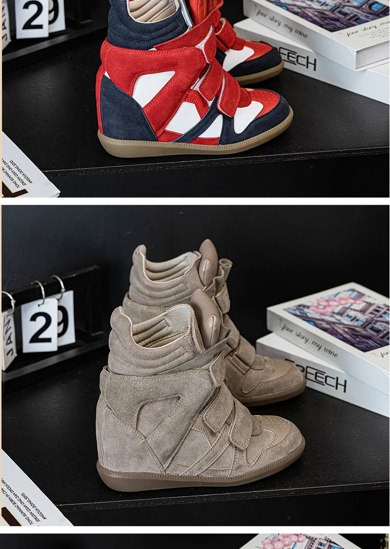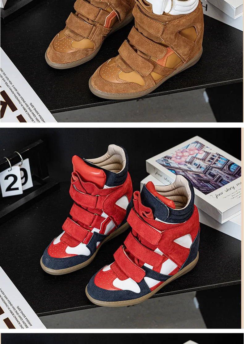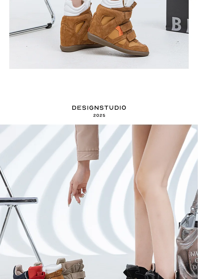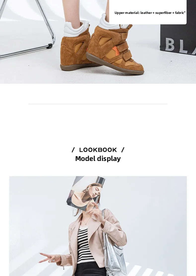 Bottines compensées intérieures +8cm hauteur secrète. Fermeture scratch magic tape enfilage facile rapide. Semelle caoutchouc durable antidérapante. Cuir peau porc + matériaux spéciaux confort. Bout rond élégant spacieux. Toutes saisons adaptées. Petites tailles disponibles. Style professionnel casual polyvalent.